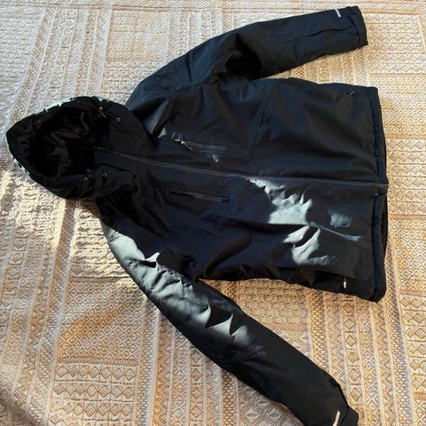 Vatten- och vindtät (HydraTex), fast huva, snölås, dragkedjefickor och reflexdetaljer.