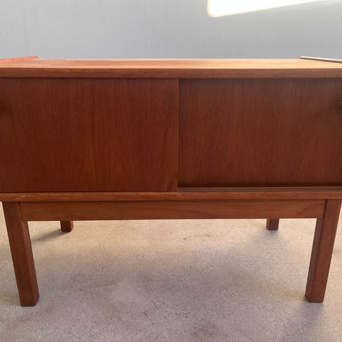 Skåp i teak som vi har använt som tv-bänk. Har gjorts ett litet hål i ena hörnet på baksidan för sladdar.