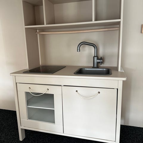IKEA barnkök i trä med ugn, spis, kylskåp och diskho. Leksaksköket är utformat för barn och har olika funktionella delar som spisplattor, ugnslucka och kylskåpsdörr. Perfekt för rollspel och utveckling av motoriska färdigheter.