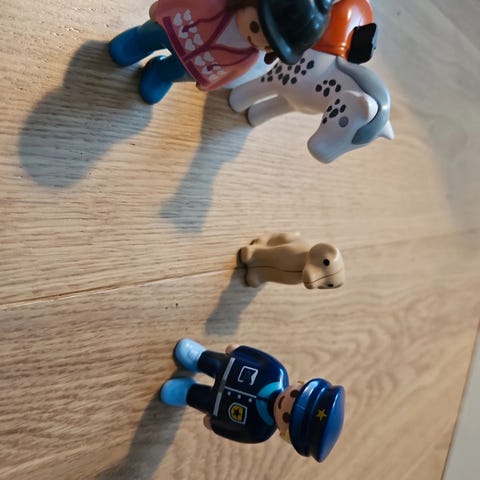 Playmobil 6043 Polisfordon i svart och grått med vita detaljer. Setet inkluderar två polisfigurer med tillbehör som vapen. Fordonet har blåljus på taket och galler på sidorna. Lämpligt som leksak för barn.