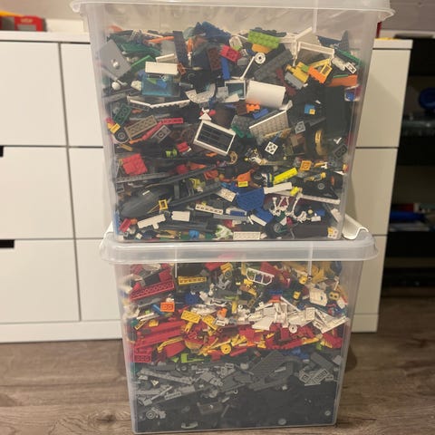 Säljes blandade LEGO-byggsatser, sammanlagt 20,9 kg. I samlingen finns flera bilar, rymdfarkoster, en robot, en brandstation, minecraftgrejer, flertalet basplattor och gubbar med mera. En samling instruktioner ingår samt lådor från Ikea som är anpassade för LEGO.