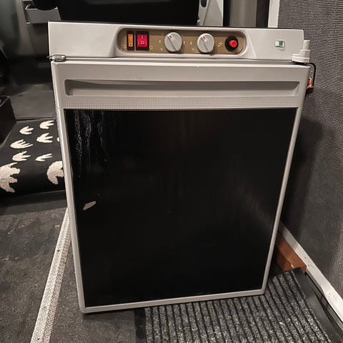 Electrolux kylskåp med klassisk design. Utrustad med justerbara temperaturkontroller och hyllplan i metall. Drivs med 12v, gasol eller 220.