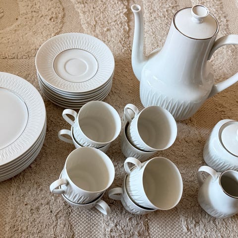 Kaffeservis (kgl pr Tettau) bröllopsgåva 1950, inklusive 11 kaffekoppar m fat, assietter, kaffekanna, gräddkanna och sockerskål med lock.