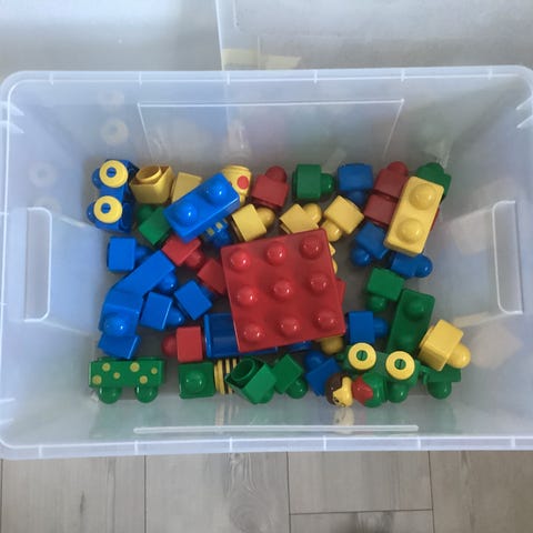 LEGO DUPLO byggklossar i olika färger och former. Passar för små barn och är tillverkade av plast. Innehåller flera bitar för kreativ lek och byggande.