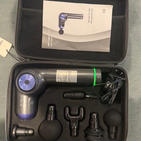 Rubinson Recovery massagegun med 20 W borstlös motor, 1200-2700 rpm hastighet, 2-4 mm amplitud, och 20 hastighetsinställningar. Batteri på 11,1 V (1500 mAh) med en batteritid på 3-4 timmar och laddningstid på cirka 4 timmar. Inkluderar 6 massagehuvuden, USB-A till USB-C laddningskabel, bärväska och manual. Färgen är svart.
