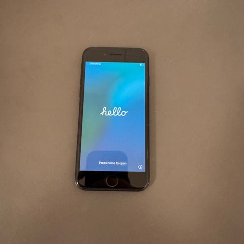 Apple iPhone 7 med 64 GB lagringsutrymme i svart färg. Mobiltelefon med medföljande laddare och hörlurar. Enheten visar startskärmen för språkval, vilket indikerar att den är återställd och redo för konfiguration.