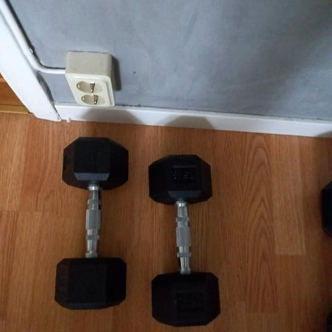 Justerbara hantlar i 2-pack med svart plastbeläggning. Varje hantel har flera viktskivor som kan anpassas efter önskad vikt. Passar för styrketräning och hemmabruk.