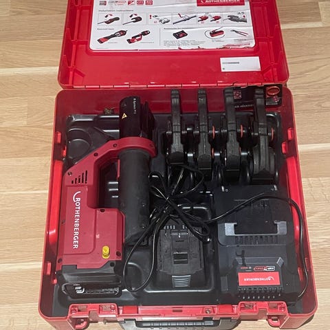 Pressmaskin Mini² med pressbackar och batteriladdare.