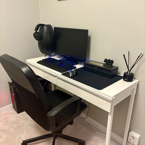 Stilrent skrivbord med enkel design och slanka linjer. Kompakt och enkelt att placera, även mitt i rummet eftersom baksidan är ytbehandlad. Två praktiska lådor för sådant du vill ha nära till hands.