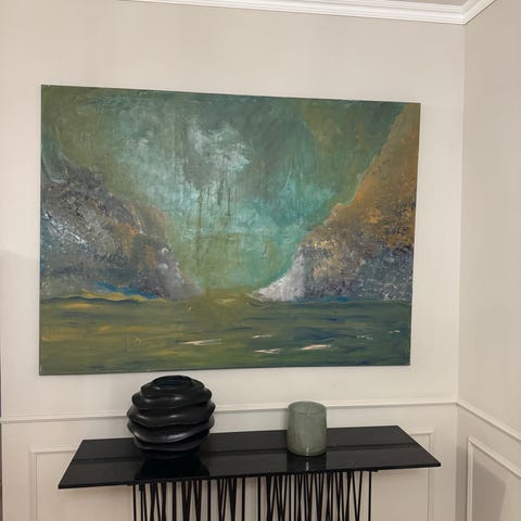 Abstrakt konstverk för väggmontering med färgtoner i svart, vitt, brunt och orange. Passar som dekorativt inslag i vardagsrum eller andra rum.