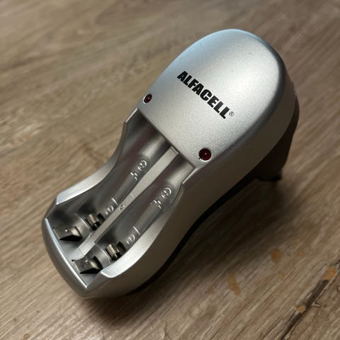 Laddaren har plats för fyra batterier samtidigt och är avsedd för uppladdningsbara batterier i storlekarna AA och AAA.