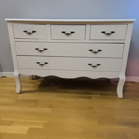 En riktigt fin vit lackerad Hemnes byrå med 8 lådor. Inga märken eller skador på byrån, perfekt fungerande lådor och allt som nytt. Du slipper en halv dags skruvande!