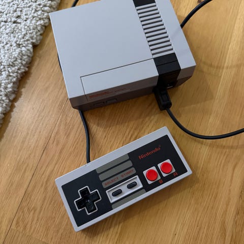 Nintendo classsic mini Inkluderar två handkontroller och anslutningskablar. Spelkonsolen är grå med svarta och röda detaljer.