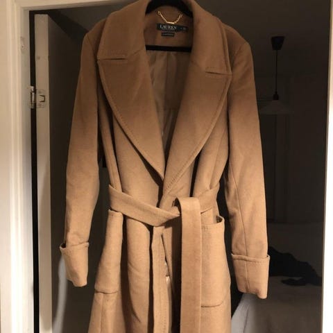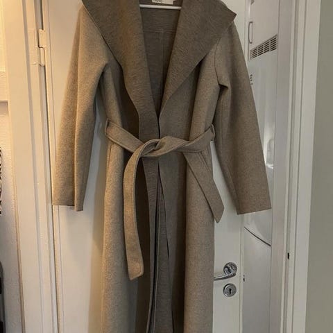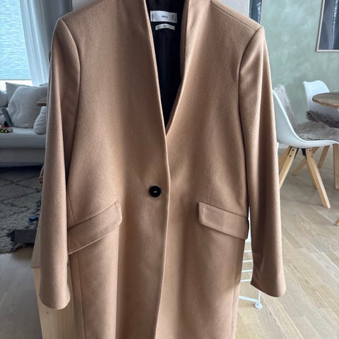 Mango ullkappa i blå färg, storlek L för dam. Kappan är tillverkad av ullmaterial och har ett bälte i midjan.