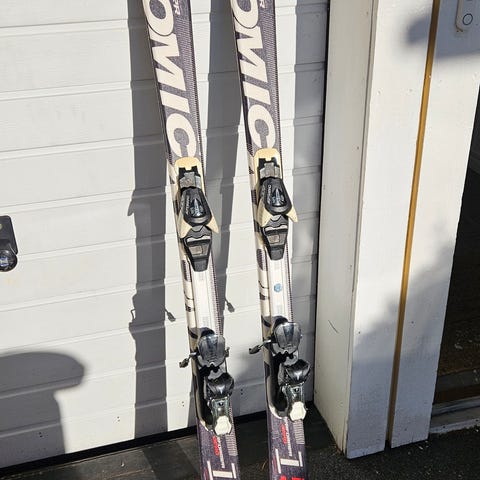 Raceskidor med några år på nacken. Mycket stabila och håller för hög fart . Nyslipade stålkanter och nyvallade.