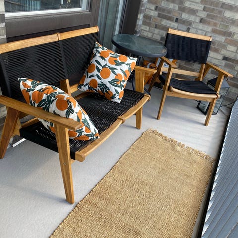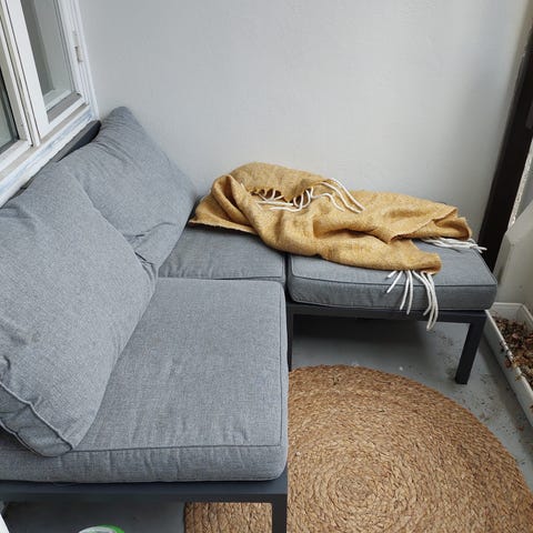 Utemöbel soffa med svart ram och gråa kuddar. Soffan har en rygg av snören och är avsedd för utomhusbruk. Kuddarna är lösa och ger extra komfort.