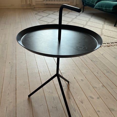 Soffbordet Don't leave me (DLM) från Hay säljes. Bordet är designad av Thomas Bentzen och är i svart metall, med ett handtag i mitten för enkel förflyttning. Det finns en del märken på lacken (se bilder).