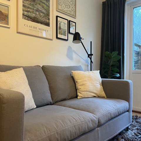 Avtagbara kuddfodral som är tvättbara. Viss normalt användningsslitage och vissa fläckar, vilket återspeglas i priset. Katt finns i hemmet. Inga konstruktionsfel.