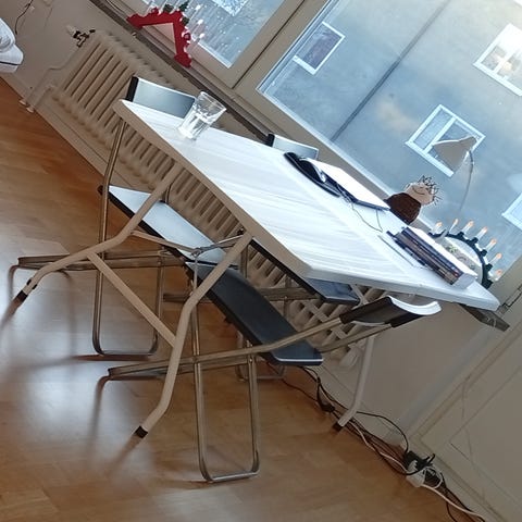 Säljer ett fint bord med medföljande stol från IKEA. Bordet har låsbara hjul och kan enkelt flyttas runt. Kan användas som skrivbord eller matbord. Köpt 2020 från Ikeas begränsade upplaga ”sammankoppla”