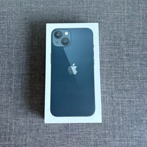 Apple iPhone 13 med 128 GB lagringskapacitet. Mobilen har en vit/ rosa färg och är utrustad med dubbla kameror på baksidan. Skärmskydd och svart mobilskal medföljer.