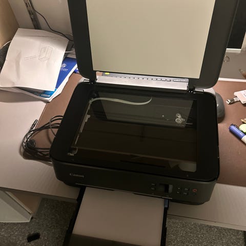 Canon PIXMA TS5055 multifunktionsskrivare med funktioner för utskrift, skanning och kopiering. Enheten är svart och har en kompakt design för hemmabruk eller kontor. Utrustad med ett användarvänligt kontrollpanel och inbyggd skanner med lock.