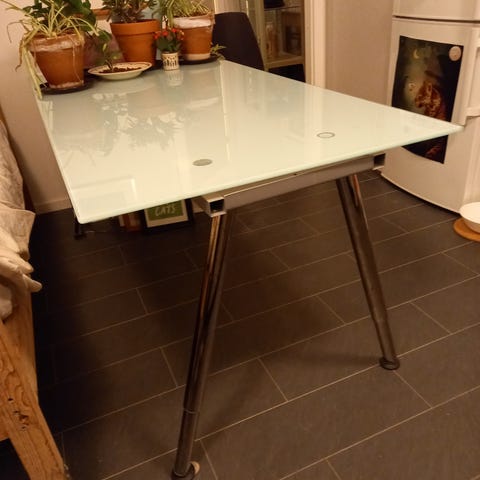 Skribord med glasskiva. Glasskiva på stålstativ. En smal skiva ingår. Kan användas som sido bord med den. En rund sak saknas. Se bild o en synlig repa.