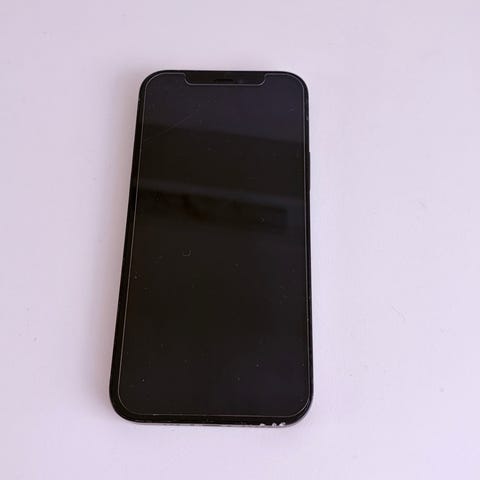 Apple iPhone 12 mobiltelefon med 128 GB lagringskapacitet i vit färg. Har en spricka som går diagonalt över skärmen men syns inte tydligt, se bilden.