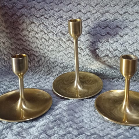 2 Antika ljusstakar i metall med tre armar för ljus. Ljusstakar har en dekorativ design och är lämplig för bord eller hylla. Den har en mörk patina och visar tecken på ålder och användning.