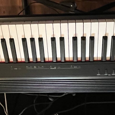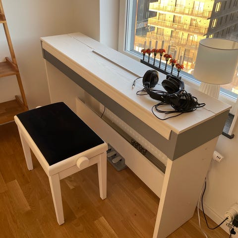 Yamaha digitalpiano med 61 tangenter i svart färg. Inkluderar strömadapter och notställ. Passar för nybörjare och musiker som söker ett portabelt keyboard.