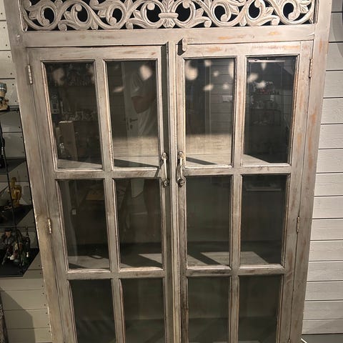 Elegant och stilrent Vitrinskåp i glas med spegel på baksidan och inbyggd belysning. Skåpet har flera hyllplan i glas för förvaring och exponering av glas och andra föremål. Passar för användning i hem eller butiksmiljö för att visa upp samlingar eller produkter.