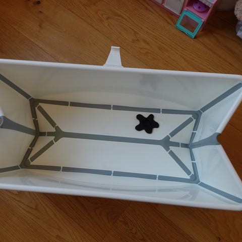 Stokke badbalja i vitt, ihopfällbart. Använd någon enstaka gång och i mycket bra skick.