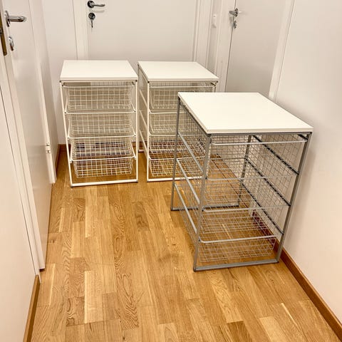 4st IKEA trådbackar 50x58 cm i nyskick (vita). Komplett med skenor och alla skruvar. Passar PAX garderober med djup 58cm.
