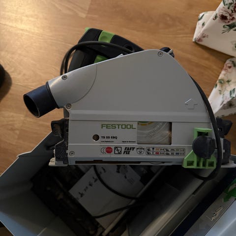 Festool HK 55 EBQ Cirkelsåg med sladdanslutning. Utrustad med ett cirkelsågblad och ergonomiskt handtag för användarvänlighet och kontroll. Designad för precisionskapning i olika material. Sågen har även sänkfunktion som ses på sista bilden.