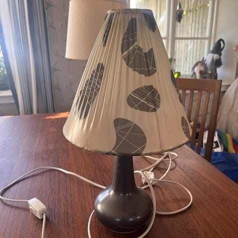 Bordslampa från Belid med en mönstrad skärm. Lampan har en kromfärgad metallfot och en smal metallstång som stödjer skärmen. Passar för användning som läslampa eller dekorativ belysning i hemmet. Höjd 59,5 cm.