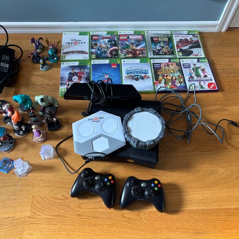 Sony Playstation 3 spelkonsol. Inkluderar konsol, två trådlösa handkontroller, 2 move motion kontroller, 15 spel, kamera och laddare. Konsolen är svart och av modellen Slim.
