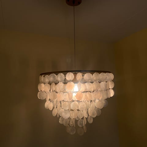 Jättesnygg taklampa går åt det guldiga (matta) lite rostiga hållet. Jättesnygg!! Stora ringen ca 40 cm, 60 cm lång utan sladd.