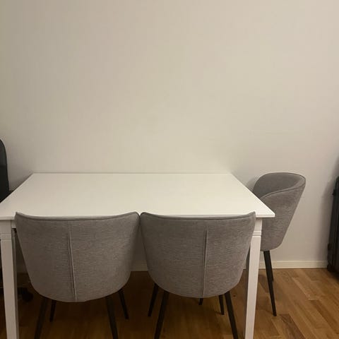 Matbord från Mio 140x90. Stolarna ingår i köpet om det önskas. Bordet är utan anmärkningar, stolarna är ganska slitna.