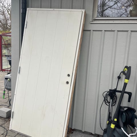 Snickar Per ytterdörr i ok skick . Dörrkarmen finns ej kvar . Rejäl och bra kvalité på dörr . Bytt pga ombyggd entré . Okänd ålder . Men mer än 25 år.