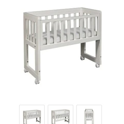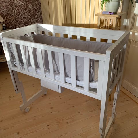 Troll bedside crib till salu. Fungerar som en säng för bebis bredvid föräldrarnas säng. Hjulen går att låsa så den står stadigt.