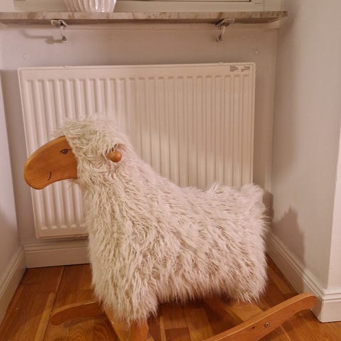 Gunghäst i mycket bra skick i gediget trä. Färg: off-white. 70x65 cm. Länk: https://www.jollyroom.se/leksaker/gunghastar-gungdjur/gungdjur/teddykompaniet-lammgunga-70x65-cm-vit
