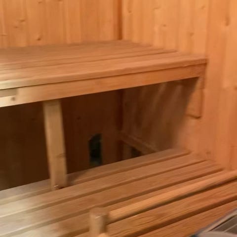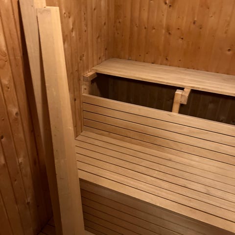 Basturum i byggsats med träpanel och två nivåer av bänkar. Lavar, aggregat och glasdörr i fint skick.