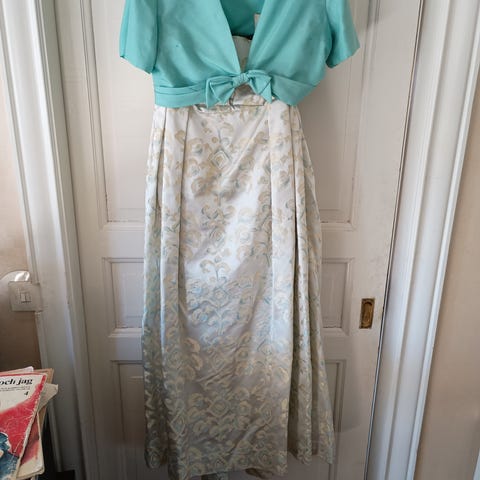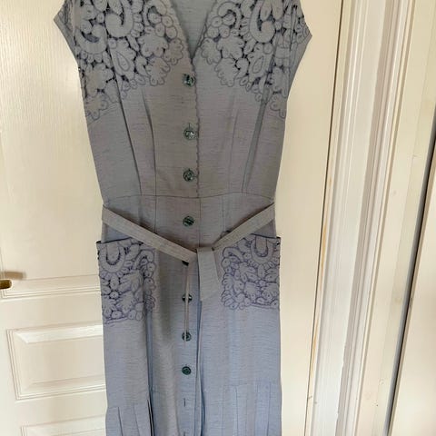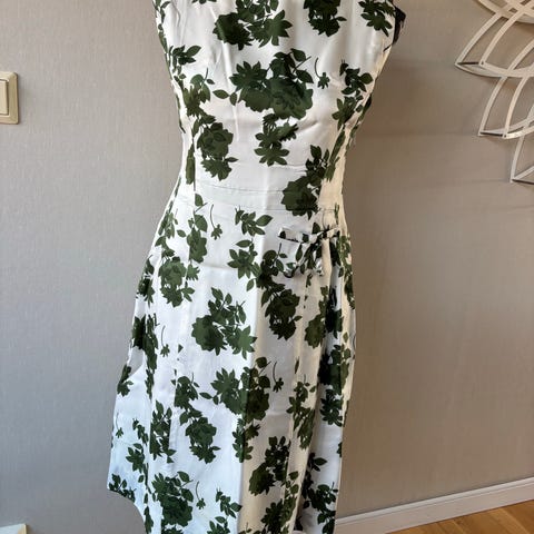 Limegrön Lång klänning med svarta prickar, märke She. Utsvängd med åtta våder, två fickor framtill. Mått , längd från ärmhålan:108 cm
