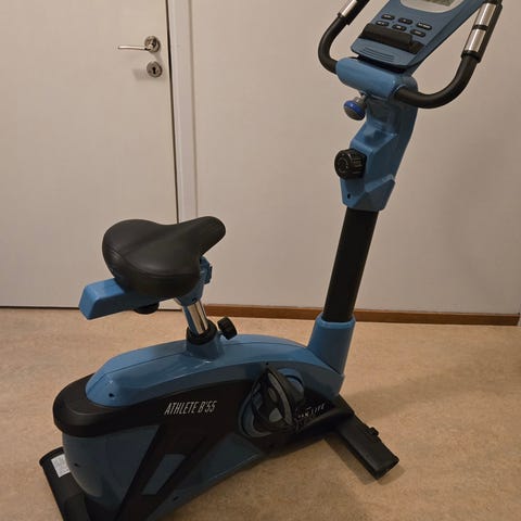 Tunturi F20 motionscykel i grå färg med justerbart sadel och digital display för att visa tid, hastighet, distans och kaloriförbrukning. Passar för hemmaträning och konditionsövningar.