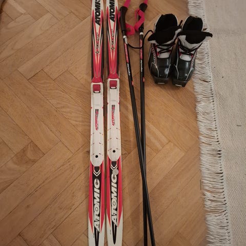 Skidor, stavar och pjäxor. Skidor 130 cm, stavar 100 cm, pjäxor stl 33.