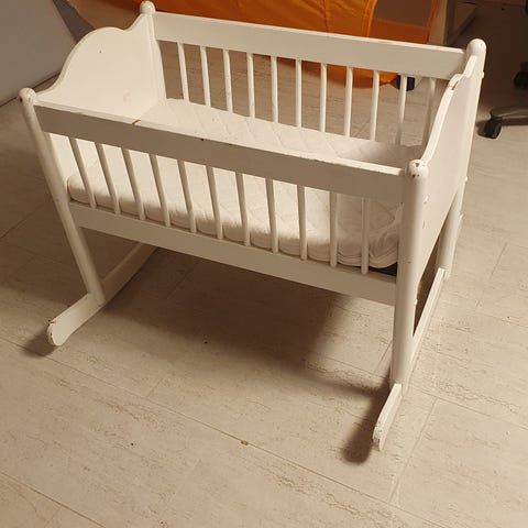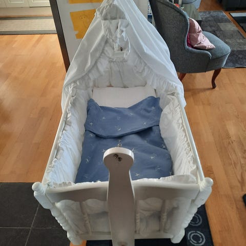 Vacker vagga i masurbjörk och mahogny. Tillverkad av en möbelsnickare. Finns i Alingsås.