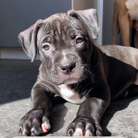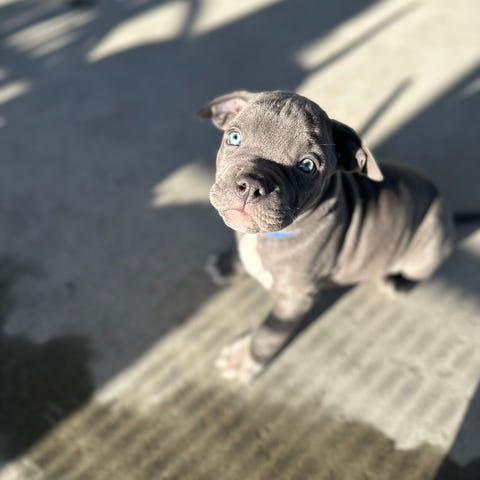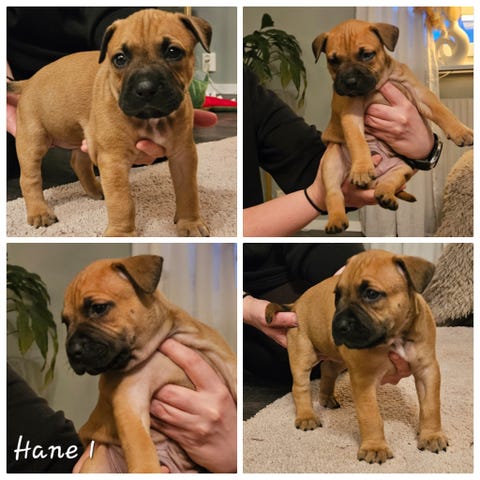 Mamman är av ras American bully. Väldigt fin i psyket och funkar bra med barn.