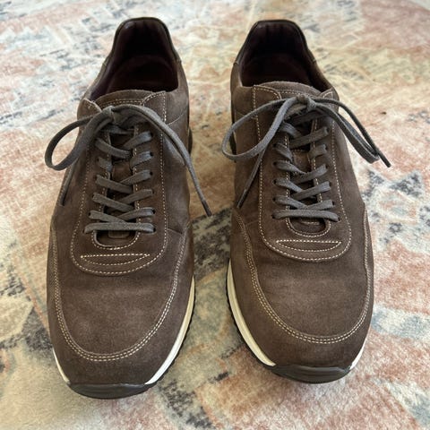 Ett par bruna skor i mocka, textil och gummisula från Hogan.