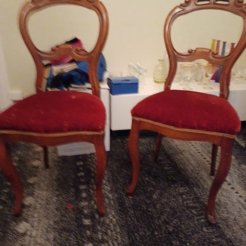 Två fina stolar med sits i guldbrokad. Finns i forsbäck men kan tas med till kungsbacka/mölndal vissa dagar.