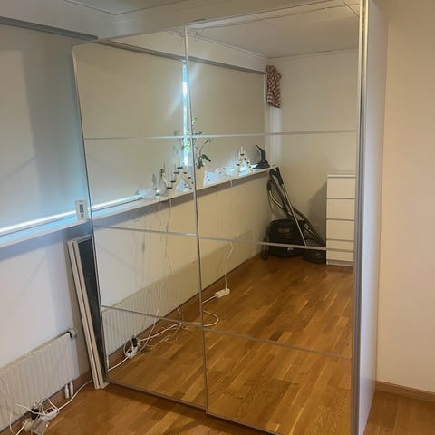 Säljer tre stycken IKEA PAX spegeldörrar, avsedda för de högre garderobsstommarna (236 cm). Varje dörr är 50 cm bred. Perfekt för den som vill ha en stor spegelyta och få rummet att kännas rymligare