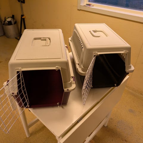 Vit kattbur i plastrotting som fungerar bra att fästa bilbälte i bil. Bra skick.